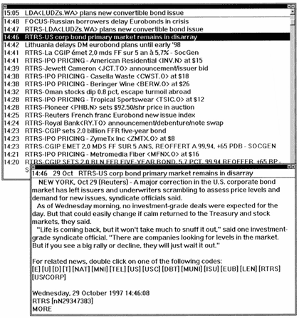 Приведенные здесь экраны Reuters демонстрируют новостные заголовки и новости, касающиеся рынка американских корпоративных облигаций.