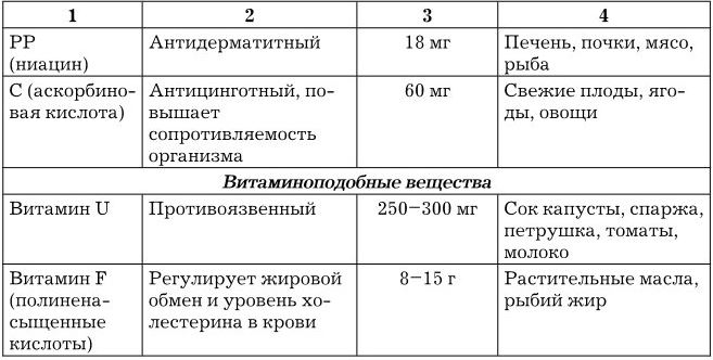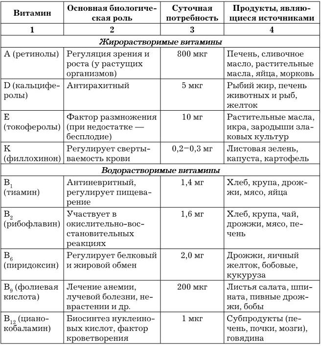 Общая суточная потребность организма в различных витаминах составляет 0,1–0,2 г. Большинство витаминов не синтезируется человеческим организмом, поэтому они должны поступать вместе с пищей. По растворимости витамины классифицируют на две группы: жирорастворимые и водорастворимые. Характеристика наиболее важных витаминов и витаминоподобных веществ приведена в табл. 1.3.
