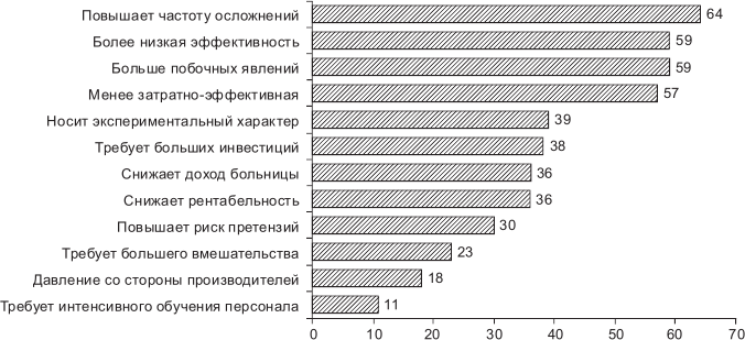 Д. Гринберг с соавторами исследовали процесс принятия решений о внедрении новых технологий в медицинских центрах Израиля [Greenberg et al., 2005]. Руководителям больниц предлагалось выбрать из перечня пять наиболее важных факторов, которые влияют на принятие решения о внедрении новой технологии, и пять наиболее важных факторов, которые влияют на отказ от внедрения новой технологии. Результаты опроса представлены на рис. 1.1 и 1.2. Как показало исследование, поведение клиник в большей степени описывает медико-индивидуалистическая система принятия решений: в первую очередь принимают во внимание клинические факторы, а также способность снижать издержки, тогда как способность приносить прибыль или повышать престиж больницы были отнесены к менее важным факторам. Необходимо, однако, учитывать, что в данном исследовании не рассматривались какие-то конкретные медицинские технологии, авторы анализировали особенности процесса принятия решений о внедрении нового оборудования, лекарств и т. д.