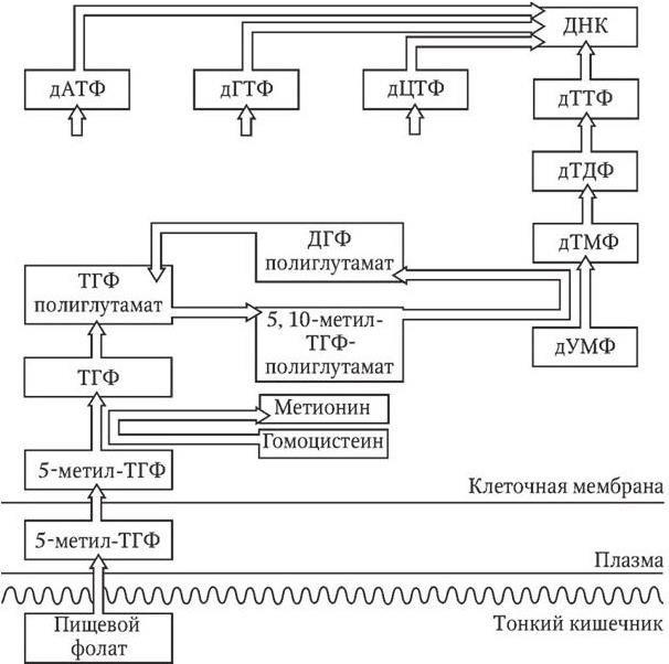 ДГФ – дигидрофолат; ТГФ – тетрагидрофолат; дАТФ – дезоксиаденозинтрифосфат; дГТФ – дезоксигуанитидинтрифосфат; дЦТФ – дезоксицитидинтрифосфат