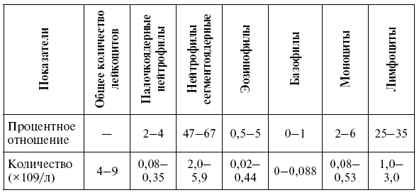 Увеличение числа лейкоцитов в периферической крови выше нормального уровня называют лейкоцитозом, уменьшение – лейкопенией. Лейкоцитоз (лейкопения) редко характеризуется пропорциональным увеличением (уменьшением) числа лейкоцитов всех видов, например лейкоцитоз при сгущении крови. В большинстве случаев имеется увеличение числа (уменьшение) какого-либо одного типа клеток. Увеличение или уменьшение числа отдельных видов лейкоцитов в крови может быть относительным или абсолютным в зависимости от общего содержания лейкоцитов – нормального, повышенного или пониженного. Изменение числа, соотношения отдельных форм и морфологии лейкоцитов зависит от вида и вирулентности возбудителя, характера, течения и распространенности патологического процесса, индивидуальной реакции организма.