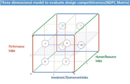 Многомерная модель получила название «матрица NDPS» (National Design Competitiveness Power), с ее помощью можно оценить конкурентоспособность по трем параметрам – ориентации на лидерство в дизайне, инвестиционной активности в дизайне, а также с точки зрения человеческих ресурсов для дизайна.