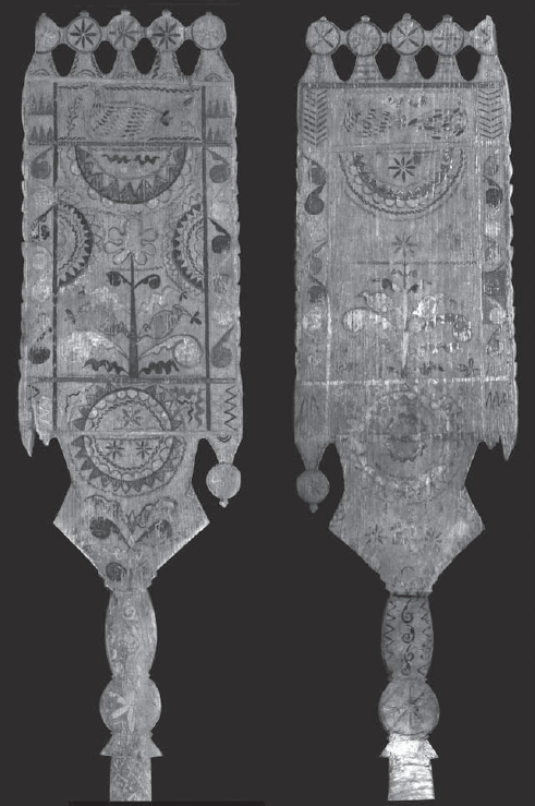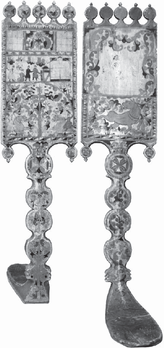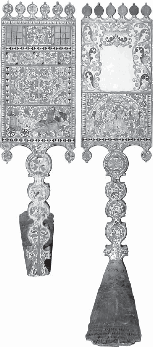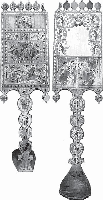 Подводя итог, попробуем поставить описанные прялки в хронологическом порядке. Самой ранней, по-видимому, является подписная прялка Степана Амосова из Ферапонтова, затем – прялка, опубликованная М.В. Суровым, и прялка из коллекции А.А. Германовича. Далее – прялка с нетрадиционным сюжетом (на смысле происходящего мы не остановились, но он, скорее всего, относится к предсвадебной обрядности), прялка из Музея этнографии и последней в этом ряду стоит прялка, принадлежащая О. и А. Ильиным. Правда, нужно подчеркнуть, что построенный эволюционный ряд имеет между крайними прялками временной интервал в пять-семь лет.