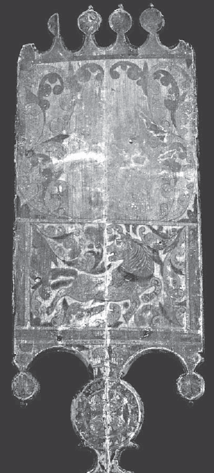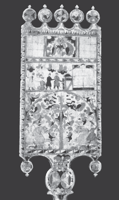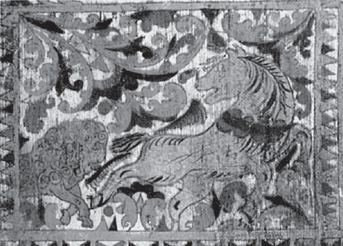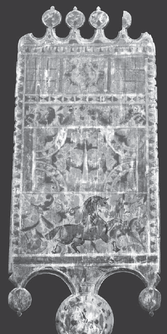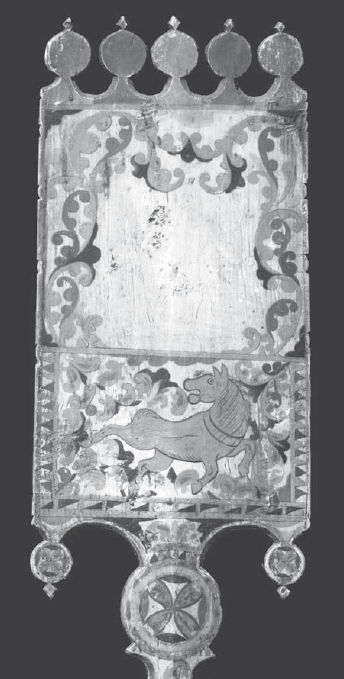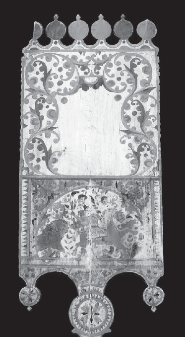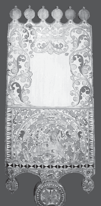 За всадником на подписной прялке из Ферапонтова помещена полуфигура льва, преследующего всадника. Очень близкий по рисунку лев помещен на прялке, фрагмент которой опубликован М.В. Суровым[16]. Замечателен образ шарахающегося коня. Контраст между переполняющим его ужасом и львом удачно подчеркнут динамичной диагональной композицией. Тема охоты поддержана колоритом на контрасте оттенков красного и темного синего, а также зеленого пигментов. На ферапонтовской подписной прялке лев не является центром композиции – он лишь дополнительный штрих к характеристике бравого всадника. Бравурности сцены вторят растительные мотивы, которые рассыпаны по фону как ракеты салюта.