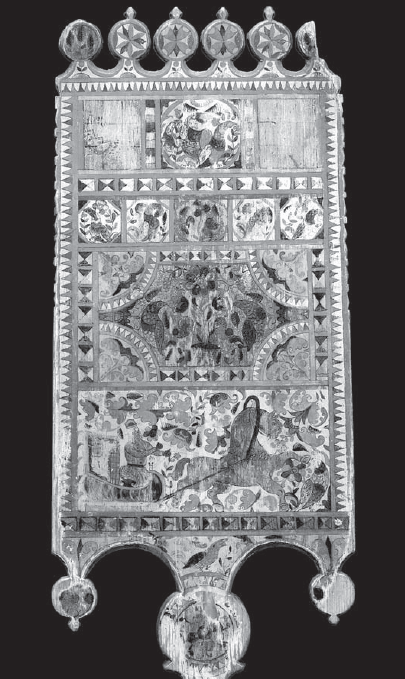 5. Подписная прялка Ильиных. Мастер Степан Амосов. 1882. Фрагмент. Верхние два яруса лицевой стороны лопаски. Собрание Ольги и Александра Ильиных (Ярославль)