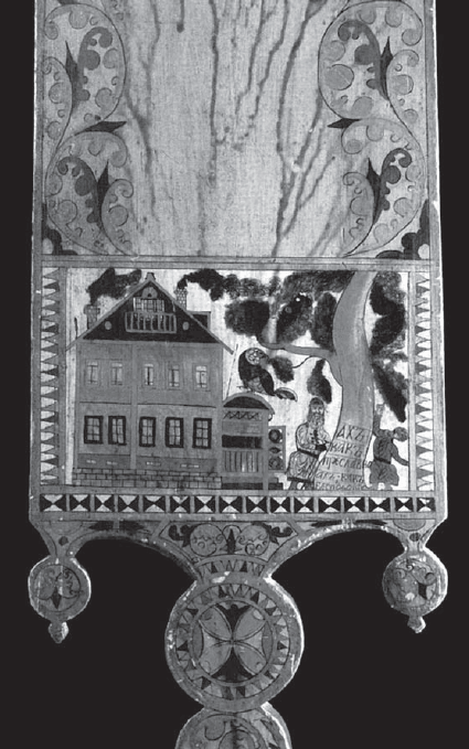 7. Подписная прялка Ильиных. Мастер Степан Амосов. 1882. Фрагмент. Оборотная сторона лопаски. Собрание Ольги и Александра Ильиных (Ярославль)
