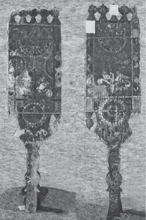 Теперь рассмотрим композиции оборотной стороны. У всех четырех прялок оборот лопаски разделен на две части. Вверху – рамка, образованная вьющимися ветвями, образованными крупными дужками с краями, загнутыми внутрь. Нижнюю треть оборота лопаски занимает сцена со всадником или конь.