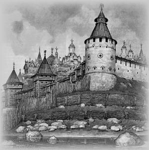 Вид Кремля при Дмитрии Донском в XIV в. Реконструкция
