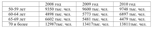 По данным статистики РФ доля лиц старше трудоспособного возраста растет с каждым годом. Так, в 2008 году их числилось – 29760 тысяч человек, в 2009 – 30097 тысяч человек, в 2010 – 30700 тысяч человек. При этом по возрастам их количество распределяется следующим образом14:
