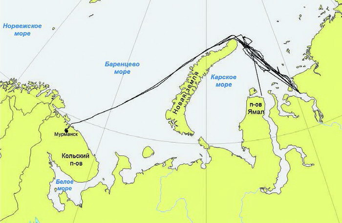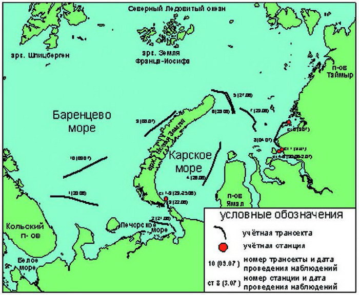 Экспедиция на а/л «Арктика» в октябре – декабре 2007 годаЭкспедиция проведена в период 27 октября – 14 декабря 2007 г. В Карском, Лаптевых и Восточно-Сибирском морях в общей сложности наблюдения проведены на 2655 км маршрута. Ввиду прохождения экспедиции в период полярной ночи, эффективное время наблюдений при дневных сумерках составляло от 1 до 3 часов в сутки, в зависимости от широты и сезона (ширина трансекты около 500 м). В оставшееся время наблюдения проводились в свете прожекторов ледокола (основной объект наблюдений – следы животных и следы дыхательной активности ластоногих – кольчатой нерпы и морского зайца, при ширине трансекты не более 30 м).