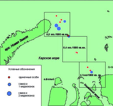 Визуально белые медведи отмечались в Карском море между Обской губой и Енисейским заливом, где была встречена семейная группа из самки и двух медвежат второго года жизни. Судя по следам, семейные группы составляли, по соотношению числа встреч 25 %, одиночные особи – 75 %. По числу особей – соответственно 43 % и 57 %. Полученные данные сходны с результатами весенних и осенних наблюдений в экспедициях ММБИ в период 1997–2002 гг (Матишов и др., 2007). В октябре 2002 г. в Карском море встречи особей в семьях составляли (по абс. числу особей) 40 %, одиночек – 60 %. По данным весенних наблюдений – медведи, составляющие семейные группы (т. е детные самки + медвежата) составляют 44,6 %, одиночки – 55,4 %.