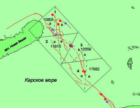 Рис. 11. Карта-схема полигона учета белых медведей в центральной части Карского моря
