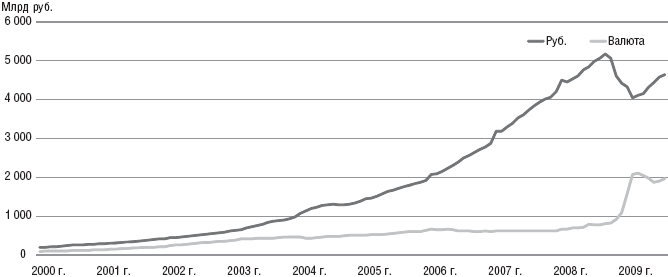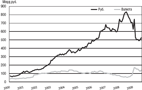 С развитием экономики страны и постепенным повышением стабильности банковской системы объем вкладов физических лиц показывал постоянный рост на уровне 30-50% в год. Кризис, начавшийся в 2008 г., снизил этот показатель до 14% (см. рис. 2.4). При этом, несмотря на то, что в периоды ослабления национальной валюты клиенты заменяют свои рублевые вклады на вклады в иностранной валюте, общий объем вкладов частных клиентов продолжает расти.
