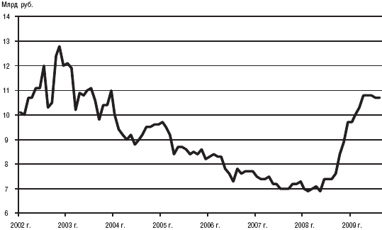 Несмотря на то что доля векселей в пассивной базе российских банков несравнима с долей вкладов, тем не менее последние годы объем выпущенных векселей постоянно растет. Векселя в рублях более распространены, чем номинированные в иностранной валюте, тем не менее, подтверждая родство с вкладами, в условиях кризиса 2008–2009 гг. наблюдалось замещение векселей в рублях векселями в валюте (см. рис. 2.8, 2.9).