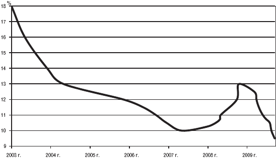 В последнее время распространилась практика ограничения максимального уровня процентных ставок по вкладам рекомендациями ЦБ РФ и мерами налогового регулирования. Так, доход по банковскому вкладу физического лица подлежит налогообложению (подоходный налог на доходы физических лиц) в случае, если процентная ставка по вкладу превышает ставку рефинансирования (рис. 2.7) на определенный процент (в настоящий момент на 5%).