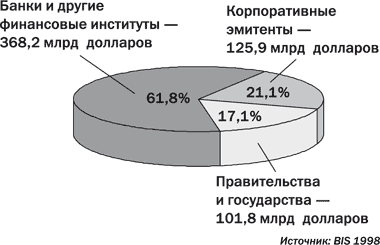 Определить с достаточной точностью долю, которая приходится на каждый из основных элементов рынка облигаций, довольно трудно. Это связано с тем, что механизмы торговли различными инструментами отличаются один от другого. Тем не менее, Банк международных расчетов (Bank for International Settlements – BIS), предоставляющий специализированные услуги центральным банкам различных государств, дает оценку сектора международных ценных бумаг. Ниже представлена его структура по результатам 1997 года.