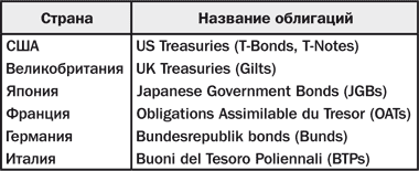 Наиболее значимыми и ликвидными внутренними рынками являются рынки правительственных ценных бумаг. Как мы уже отмечали, правительственные облигации имеют различные обозначения. Приведем некоторые из них.