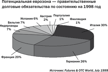 Рынок правительственных ценных бумаг имеет большое значение в силу его размера и того, что он используется в качестве ориентира для установления цен на другие облигации. По номинальной стоимости выпущенных облигаций самым крупным в мире является рынок облигаций правительства США. На европейских рынках бумаг с фиксированным доходом лидирует Италия. На диаграмме ниже представлено распределение выпущенных долговых обязательств стран, входящих в Европейский валютный союз, по состоянию на 1998 год.