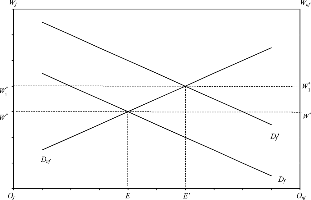 Допустим теперь, что благодаря экономическому росту в формальном секторе произошел сдвиг кривой спроса на труд вверх от Df к Df', тогда как в неформальном ничего не изменилось. В этих условиях фирмы из формального сектора начнут повышать заработную плату, чтобы привлечь дополнительных работников, а фирмы из неформального сектора начнут повышать ее, чтобы предотвратить их отток. Новое равновесие установится при уровне заработной платы W1*(W1*>W*), при этом численность занятых в формальном секторе увеличится до Of E', а в неформальном сократится до Onf E'.