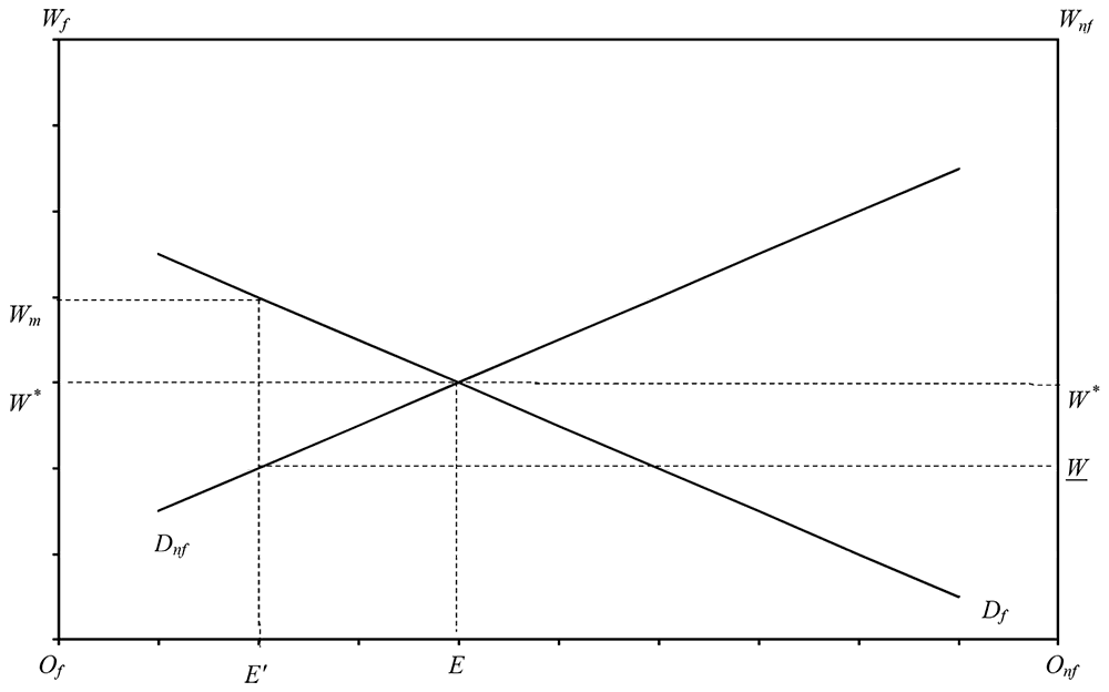 Предположим, что экономика состоит из двух секторов – формального и неформального, так что вся рабочая сила распределяется между ними. Все работники идентичны и готовы работать там, где им заплатят больше. Рынок труда можно считать интегрированным, если они будут получать одинаковую заработную плату независимо от того, где они заняты. По левой оси на рис. 1.1 откладываются различные значения заработной платы в формальном секторе (Wf), по правой – в неформальном (Wnf). График спроса на труд в первом из них представлен кривой Df, а во втором – кривой Dnf. Совокупному предложению рабочей силы соответствует расстояние между точками Of и Onf. Если заработная плата в обоих секторах отличается гибкостью, то ее равновесный уровень W* будет определяться пересечением кривых спроса Df и Dnf. При таком ее значении Of E работников попадут в формальный сектор и OnfE работников – в неформальный. В ситуации равновесия предельный работник будет безразличен к выбору того или иного сектора, поскольку в обоих он будет оплачиваться одинаково.