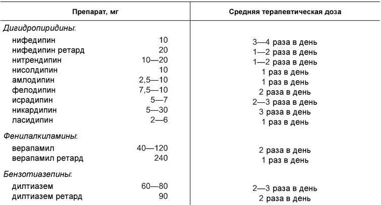 Доза и частота приема наиболее широко используемых в клинике кальциевых антагонистов