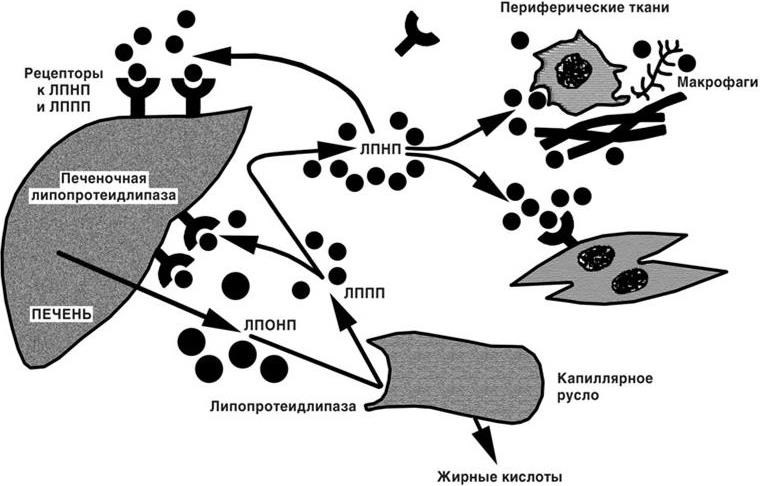 В крови холестерин и триглицериды циркулируют в виде сферических макромолекуляных комплексов (частиц), содержащих также фосфолипиды, белки и эфиры холестерина (липопротеиды). Эти частицы в соответствии с размерами и плотностью подразделяются на пять основных классов. Самые крупные из них — хиломикроны – переносят триглицериды и небольшое количество холестерина из стенки кишечника в кровь. Синтезированный в печени холестерин поступает в кровь в составе липопротеидов очень низкой плотности (ЛПОНП). В крови под влиянием липопротеидлипазы, локализованной, преимущественно, на эндотелии, липопротеиды очень низкой плотности расщепляются до липопротеидов промежуточной плотности (ЛППП). Липопротеиды промежуточной плотности под влиянием печеночной липопротеидлипазы превращаются в липопротеиды низкой плотности (ЛПНП). Липопротеиды низкой плотности содержат максимальное количество холестерина и являются наиболее атерогенными. Они интенсивно захватываются печеночными клетками и периферическими тканями, в том числе макрофагами (рис. 1.2). Поступление липопротеидов низкой и промежуточной плотности в печеночную клетку – рецепторопосредованный процесс. Количество рецепторов в печеночной клетке в значительной мере генетически детерминировано, и при их недостатке возникает один из вариантов наследственной гиперхолестеринемии. В печени из липопротеидов низкой плотности образуются липопротеиды высокой плотности (ЛПВП). Кроме того, значительная часть холестерина липопротеидов промежуточной и низкой плотности в печеночной клетке метаболизируется до желчных кислот и поступает в кишечник. Липопротеиды высокой плотности обладают антиатерогенным действием, поскольку они способны захватывать холестерин в тканях (клетках) и удалять его (обратный транспорт холестерина). Кроме того, липопротеидам высокой плотности присуща антиоксидантная активность, препятствующая перекисному окислению ЛПНП. Поскольку ЛПВП обладают антиатерогенными свойствами, то их взаимоотношение с другими классами липопротеидов в определяющей мере формирует атерогенный потенциал крови.