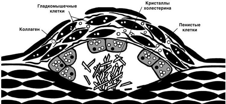 Часть пенистых клеток постепенно разрушается, и содержащиеся в них холестерин и его эфиры оказываются вне клеток, образуя «липидное ядро» будущей бляшки, которое постепенно покрывается соединительнотканными элементами, гладкомышечными клетками и эндотелием.