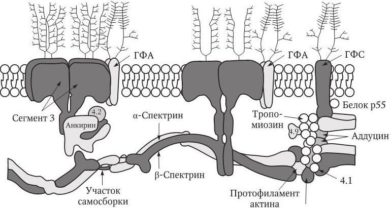 Рис. 5.5. Схематическое представление структуры цитоскелета эритроцита человека (Blood. Principles and Practice of Hematology. – Philadelphia: Lippincott, 1995. – Р. 1726): ГФА – гликофорин А; ГФС – гликофорин С