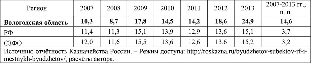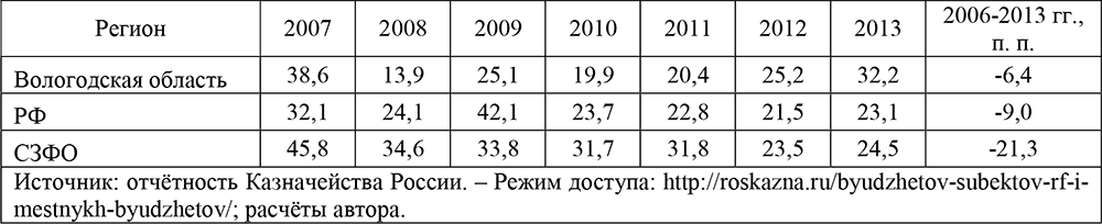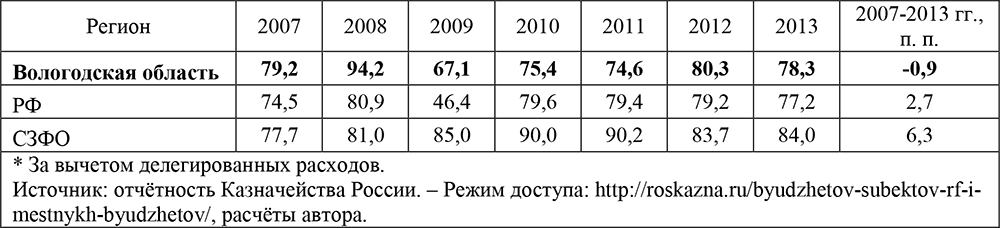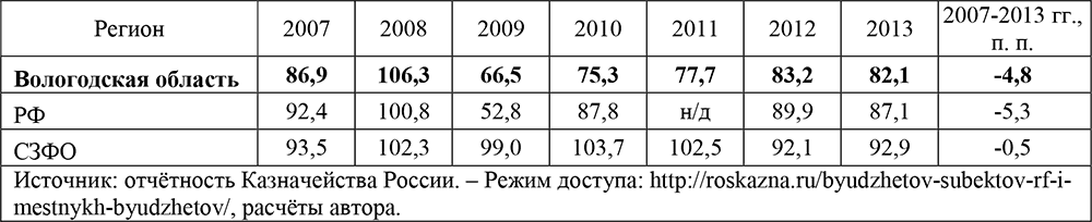 Для Вологодской области в 2007–2013 гг. был свойственен дефицит собственных доходных возможностей по финансированию закрепленного за субфедеральным уровнем комплекса расходных обязательств. Его размер по состоянию на 2013 год составлял без малого 78 % (табл. 4). Текущее положение отражает отсутствие возможностей по дальнейшему расширению расходных полномочий, возлагаемых на региональный и местный уровни без их пересмотра, либо увеличения финансовой поддержки со стороны федерального центра.