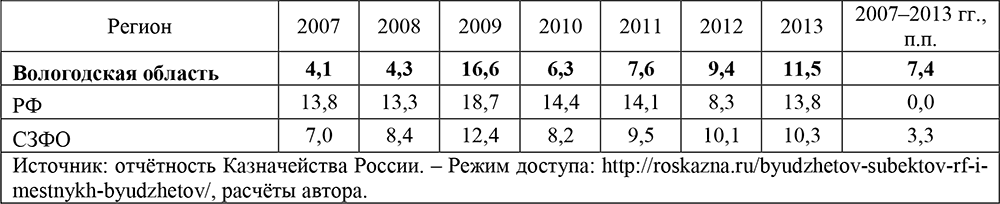 Величина данных расходов в Вологодской области увеличилась с 0,2 % в 2007 году до 4,2 % в 2013 году или в 21 раз. Рост затрат на обслуживание заимствований сокращает и без того ограниченные возможности субфедеральных бюджетов для исполнения социальных обязательств и обеспечения устойчивого социально-экономического развития за счёт осуществления бюджетных капиталовложений.