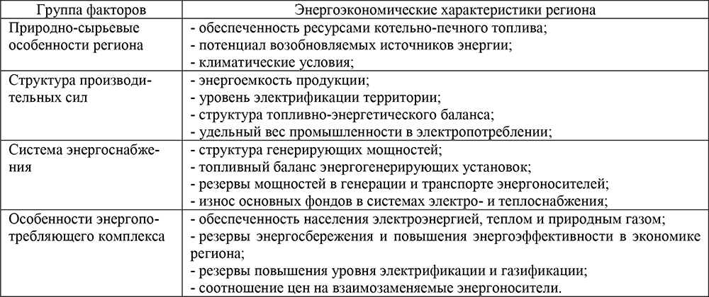 Российская Федерация занимает огромную территорию, и указанные в таблице факторы по-разному проявляются в различных ее регионах (в данной работе под регионом понимается субъект РФ). Более того, даже в пределах одного региона могут быть районы, сильно отличающиеся друг от друга по условиям хозяйствования, особенностям энергопотребления и даже по климатическим условиям.