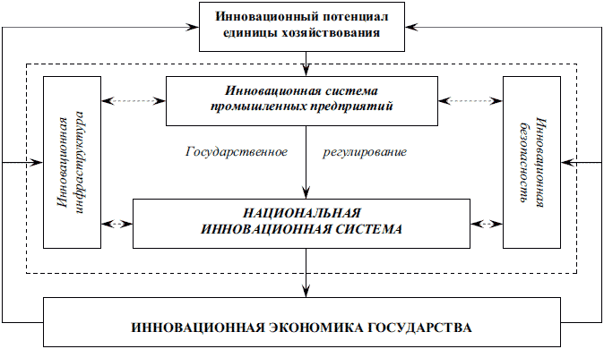 В связи с этим институциональная модель регулирования инновационной экономики государства включает в себя (рис. 1.3): инновационный потенциал единицы хозяйствования; национальную инновационную систему; систему обеспечения механизма функционирования инновационной экономики (инновационная инфраструктура, инновационная безопасность, государственное регулирование).