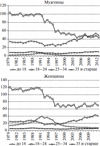 В последние полтора десятилетия увеличение интенсивности брачности в России происходило только у мужчин и женщин в возрастах 25 лет и старше (табл. 2.3, рис. 2.5). Этот длительный рост – относительно новое для России явление. Начиная с 1960-х и вплоть до начала 1990-х гг. брачность в России скорее «молодела». Перелом произошел в середине 1990-х гг. Начиная с 2001 г. показатели брачности для возрастной группы 25–34 года превышают уровень 25-летней давности, а для лиц 35 лет этот уровень был превышен в 2007 г. В 2009 г. интенсивность заключения брака у мужчин в возрастной группе 25–34 года впервые в российской истории превысила показатели в более молодой группе 18–24-летних. Коэффициенты брачности для 18–24-летних мужчин и женщин сократились в России в 2 раза за короткий период активных политических и экономических реформ (с конца 1980-х и до середины 1990-х гг.) и с тех пор не демонстрируют сколько-нибудь заметных изменений. В 2012 г. коэффициент брачности в этой возрастной группе составил для мужчин 45 %, а для женщин – 59 % от уровня 1989–1990 гг. С начала 2000-х гг. уровень брачности в самых молодых бракоспособных возрастах и у мужчин, и у женщин практически стагнирует на одном уровне, слабо отзываясь на изменение экономической конъюнктуры (см. рис. 2.5). Следует также отметить, что брачность для юношей и девушек до 18 лет, также резко снизившись, превратилась в статистически незначимое явление: в 2012 г. было заключено 945 браков, в которых жениху не исполнилось 18 лет, и 10398 браков, в которых невеста была такого же возраста, что на 1000 населения соответствующего пола и возраста составляет 0,6 и 7,4. Браки с несовершеннолетним женихом составляют менее 0,1 % всех браков у мужчин и с несовершеннолетней невестой – менее 1 % всех браков у женщин.