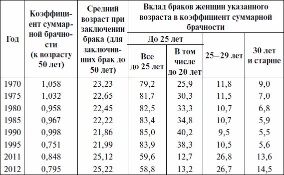 Таблица 2.2. Некоторые обобщающие характеристики первых браков для женщин, Россия, 1970–2012 гг.*