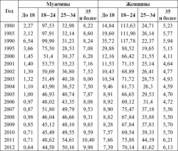 Таблица 2.3. Возрастные коэффициенты брачности мужчин и женщин (число заключенных браков на 1000 населения соответствующего пола и возраста), 1980–2012 гг.