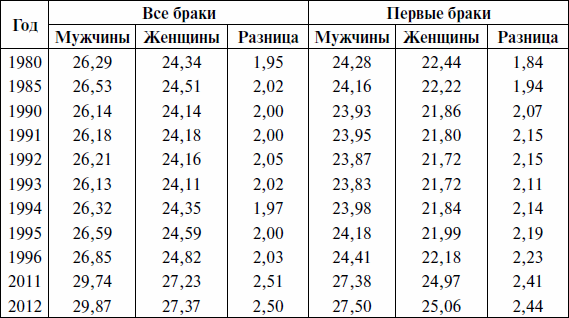 Таблица 2.4. Средний возраст мужчины и женщины при регистрации брака (для женихов и невест, заключивших брак в возрасте до 50 лет), 1980, 1985, 1990–1996 и 2011–2012 гг.