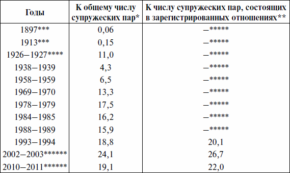 Источники: Вишневский А. Г., Тольц М. С. Эволюция брачности и рождаемости в советский период // Население России за 70 лет / отв. ред. Л. Л. Рыбаковский. М.: Наука, 1988. С. 86; Тольц М. С., Харькова Т. Л. Разводимость // Народонаселение: энциклопедический словарь / редкол. Г. Г. Меликьян (гл. ред.) и др. М.: БРЭ, 1994. С. 369; Volkov A. New features of family formation and composition: Case of Russia // Revue Baltique. 1999. No. 13. P. 84; расчеты С. Захарова на основе официальных данных переписей населения 2002, 2010 гг. и микропереписи населения 1994 г. с исправлением опечаток и ошибок, допущенных предыдущими авторами, в оценках для более ранних исторических периодов.