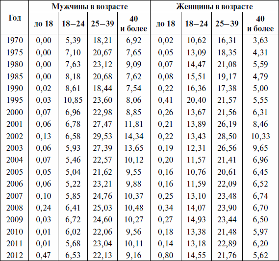 Таблица 2.6. Число разводов на 1000 мужчин и женщин в отдельных возрастных группах, Россия, 1970–2012 гг.