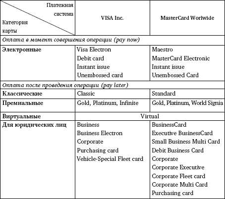 Наиболее распространенные в мире платежные системы VISA Inc. и MasterCard Worldwide доминируют и на российском рынке банковских услуг, наращивая год от года количественные и качественные показатели своего присутствия. Карточные продукты обеих платежных систем строго сегментированы для наиболее полного охвата аудитории пользователей. Порядок сегментации продуктового ряда у VISA Inc. принципиально схож с порядком в MasterCard Worldwide, что позволяет не описывать каждый продукт каждой платежной системы в отдельности, а объединить их по категориям и подробнее остановиться на особенностях. В связи с наличием в продуктовой линейке платежных систем ряда специфических карт, не представленных в настоящее время на российском развивающимся рынке, рассмотрим только востребованные и перспективные карточные продукты.