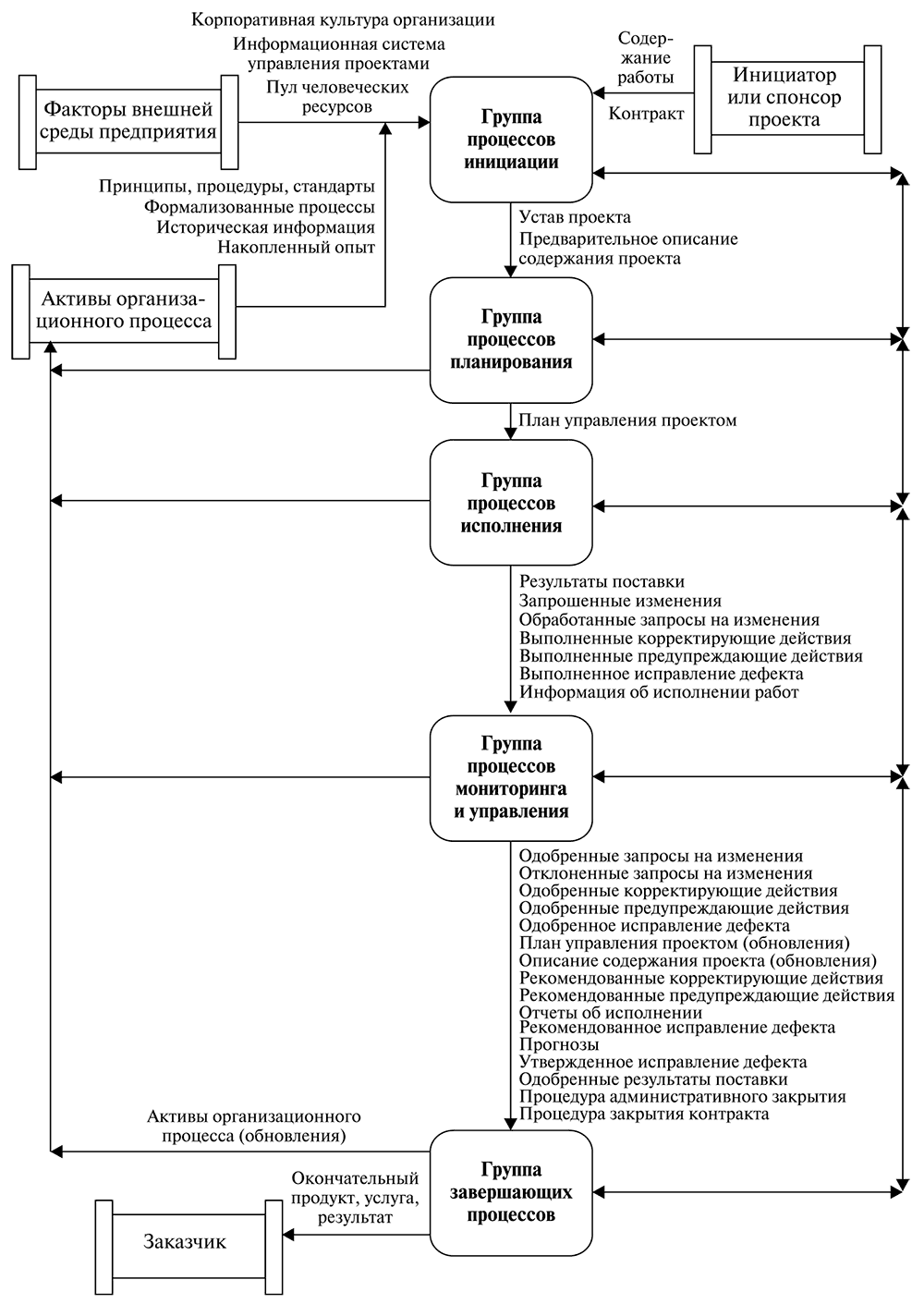 Согласно Руководству к своду знаний по управлению проектами [PMBOK, 2004], выделяют пять групп процессов управления проектом, необходимых для любого проекта: они обладают четкими зависимостями и выполняются в одной и той же последовательности в каждом проекте. Они не зависят от областей приложения или отрасли. Отдельные группы процессов, а также входящие в них процессы неоднократно повторяются при выполнении проекта.
