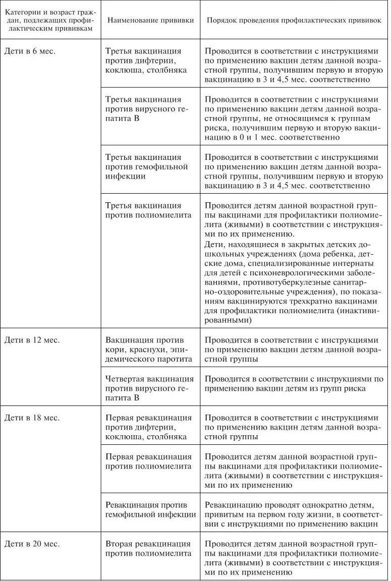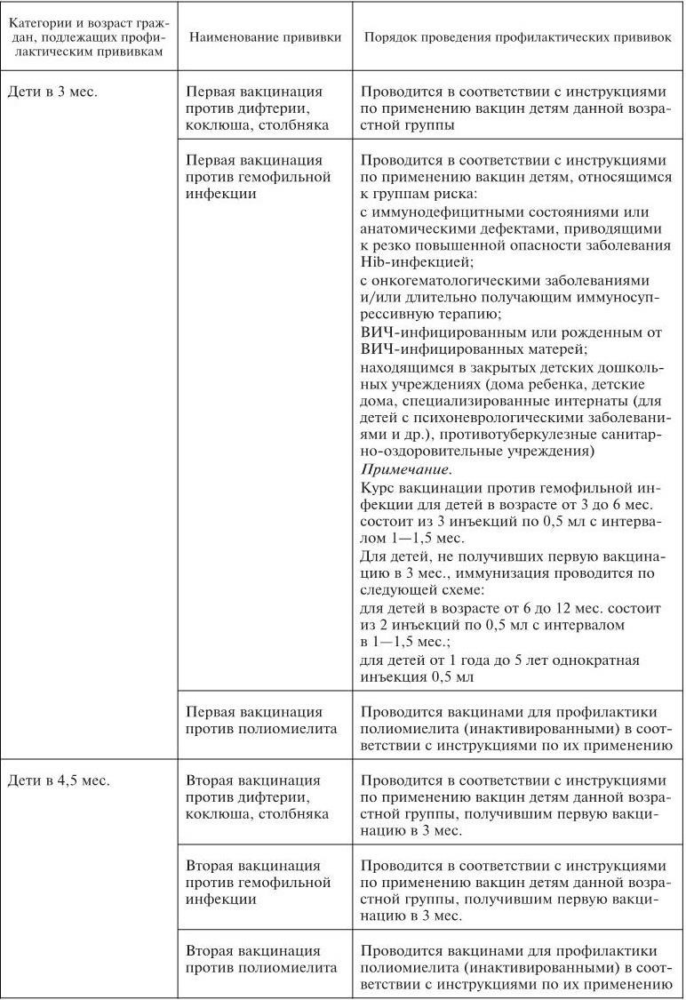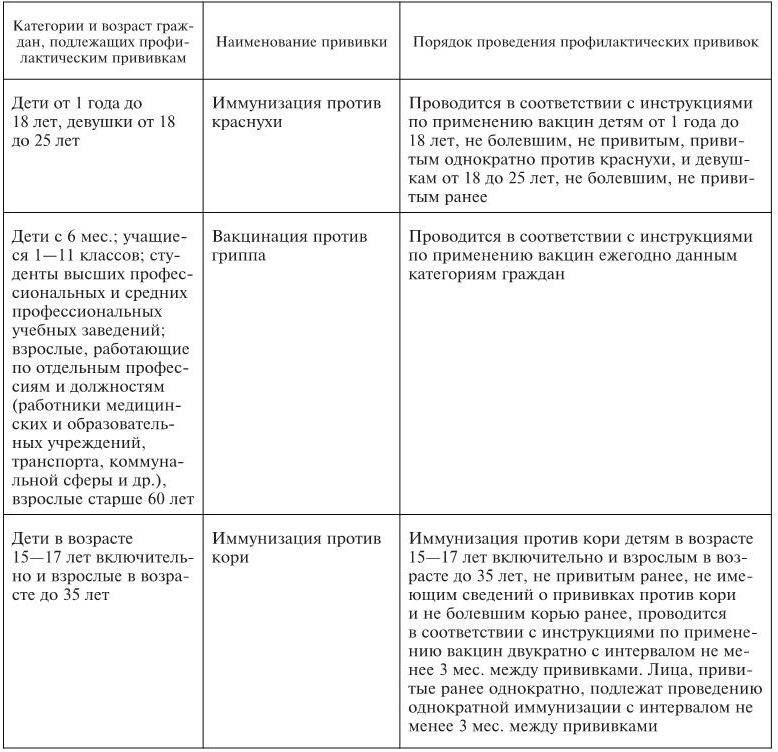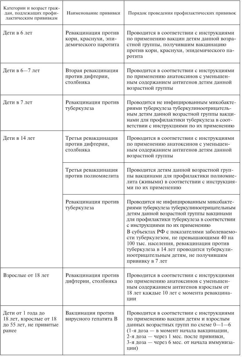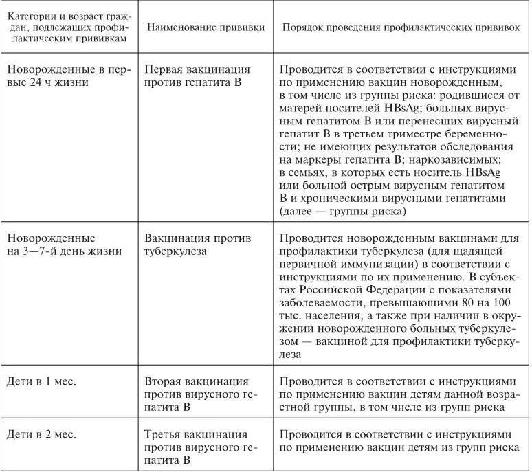 Календарь профилактических прививок в России в соответствии с приказом МЗ и СР РФ от 31 января 2011 г. № 51н представлен в табл. 1.