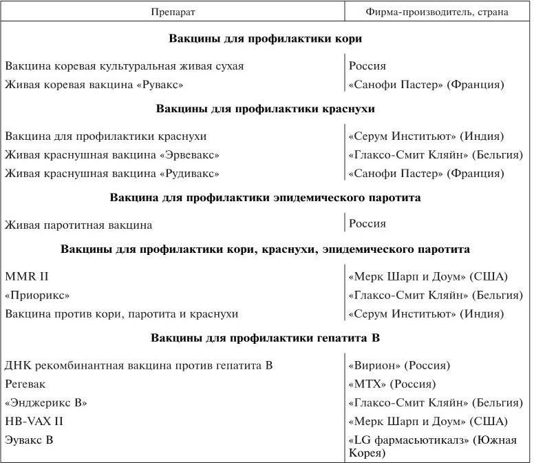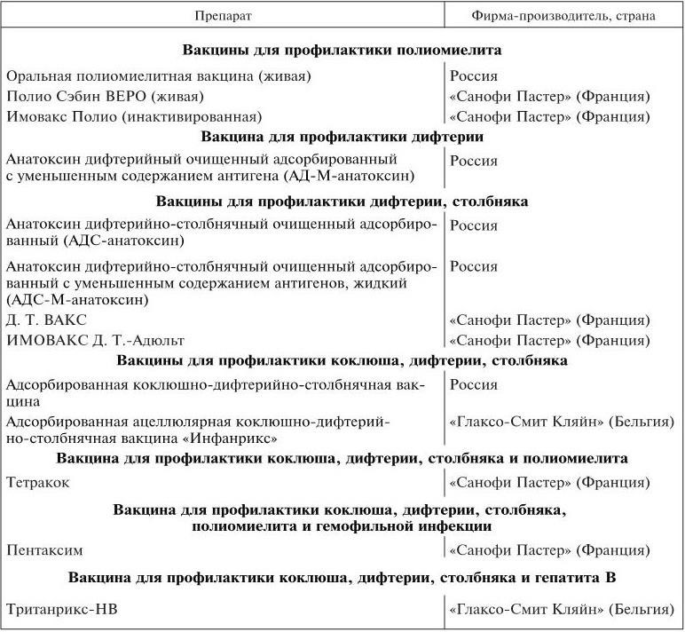 Ниже представлен перечень некоторых используемых вакцин отечественного и зарубежного производства (табл. 2).