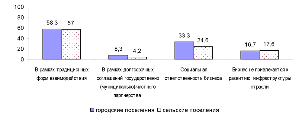 В свою очередь, использование государственно– муниципально-частного партнерства власти и бизнеса в ЖКХ (концессия, аренда с инвестиционными обязательствами) крайне ограниченно. На использование данных механизмов партнерства власти и бизнеса в своем муниципальном образовании указали только 8 % глав городских поселений и 4 % руководителей сельских поселений области. При этом порядка 17 % глав отметили, что бизнес вовсе не привлекается к развитию сферы ЖКХ территории.
