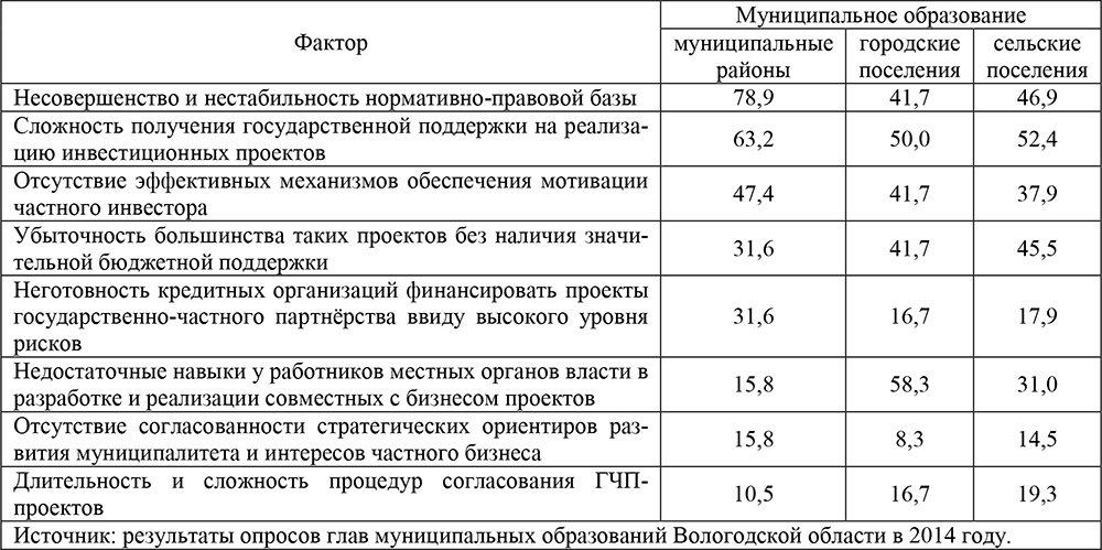 Таблица 2. Факторы, сдерживающие развитие механизмов государственно-частного партнерства (в % от числа ответивших)