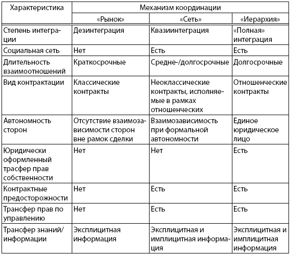 В 1990-е гг. стало расти число теоретических работ, в которых развивается подход к пониманию сети как особого механизма координации, который отличен, с одной стороны, от иерархического регулирования, а с другой – от рыночной координации (см., например, [Grandori, Soda, 1995; Шерешева, 2010; Институциональная экономика…, 2011]). Каждый из этих механизмов однозначно характеризуется набором критериев, включая тип базового контракта, характеристики предметов обмена (доступность, тип экономического блага и т. п.), тип механизма принуждения контрактов к исполнению, доступность контрактации, уровень защищенности прав собственности на предметы обмена, способ координации действий по распределению и определению направлений использования ресурсов, стимулы к эффективному использованию ресурсов, а также интенсивность регулирования взаимодействий.
