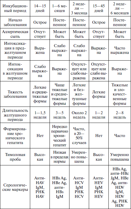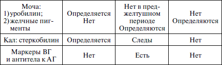 При печеночных (паренхиматозных) желтухах острый гепатит А в первую очередь необходимо дифференцировать с другими вирусными гепатитами: ВГВ, ВГС, ВГС и ВГД. Основные дифференциально-диагностические критерии этих гепатитов приведены в табл. 3.