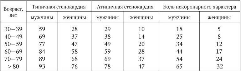 Априорная вероятность диагноза хронической ИБС в зависимости от характера боли в грудной клетке, %