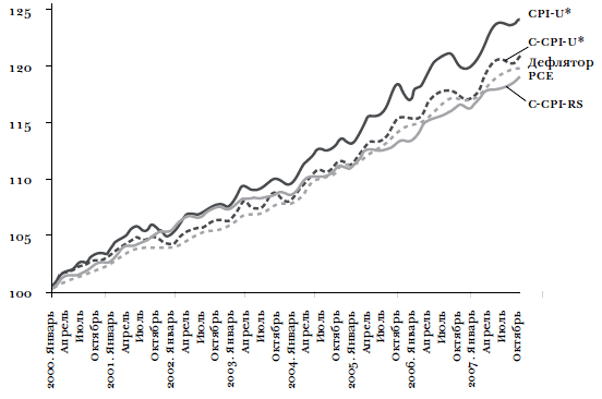 Несмотря на то что из многих аспектов CPI следует высокая вероятность отклонения в сторону завышения, важно понимать, что могут случаться и случаются ошибки в сторону занижения; например, вполне может оказаться, что хронически переоценивался компонент CPI, связанный с жильем [Gordon, 2003; Gordon, Van Goethem, 2007]. Важно и то, что исследователи в своих попытках оценить и усовершенствовать CPI обращают внимание на любые отклонения (и в сторону завышения, и в сторону занижения), а не только на первые. Нам нужен как можно более точный индекс цен, а не такой, у которого наблюдается самый медленный прирост.