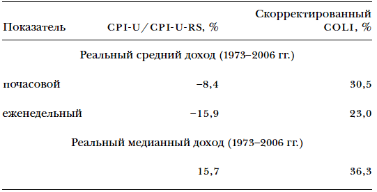 ОТКЛОНЕНИЕ ИЗМЕРЕНИЯ CPI-U: 1,1 % в 1973–1995 гг.; 0,8 % в 1996–2006 гг. Медианный доход уже пересчитан в соответствии с CPI-U-RS, который возрастал медленнее, чем CPI-U, примерно на 0,43 % в год.