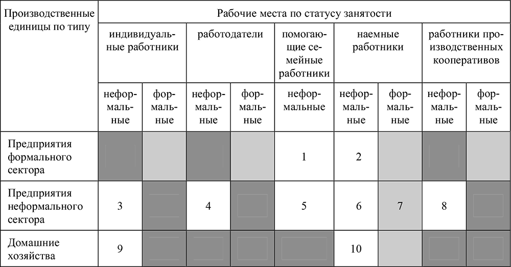 Примечание: неформальная занятость: ячейки 1–6, 8—10; занятость в неформальном секторе: ячейки 3–8; неформальная занятость вне неформального сектора: ячейки 1, 2, 9 и 10.